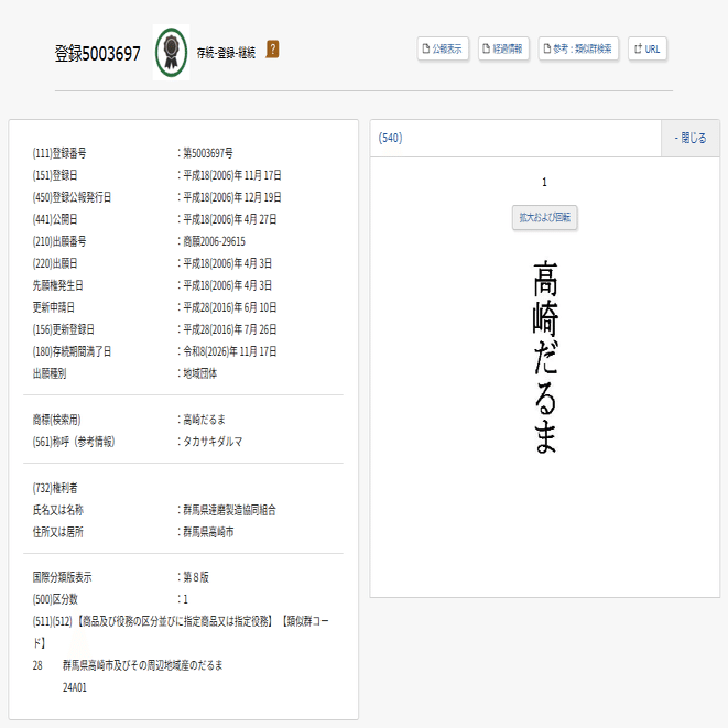 今回ご紹介する高崎だるまも、商標登録 第5003697号として、第28類の「群馬県高崎市及びその周辺地域産のだるま」という商品において、名前が守られています。